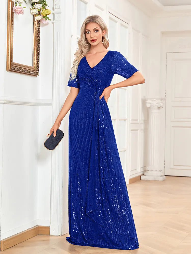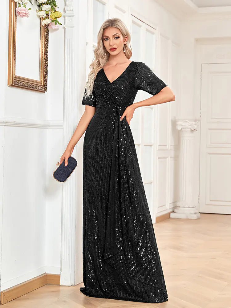 Elevate your style with our stunning Short Sleeve Dress, featuring a chic V-neck design and dazzling sequins that shimmer with every movement. This slim fishtail dress is perfect for any occasion, from elegant evenings to lively parties.