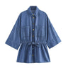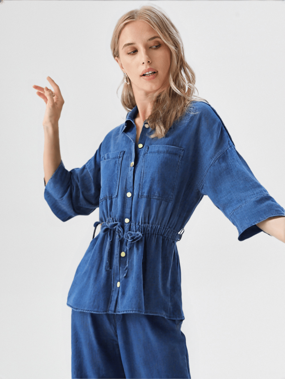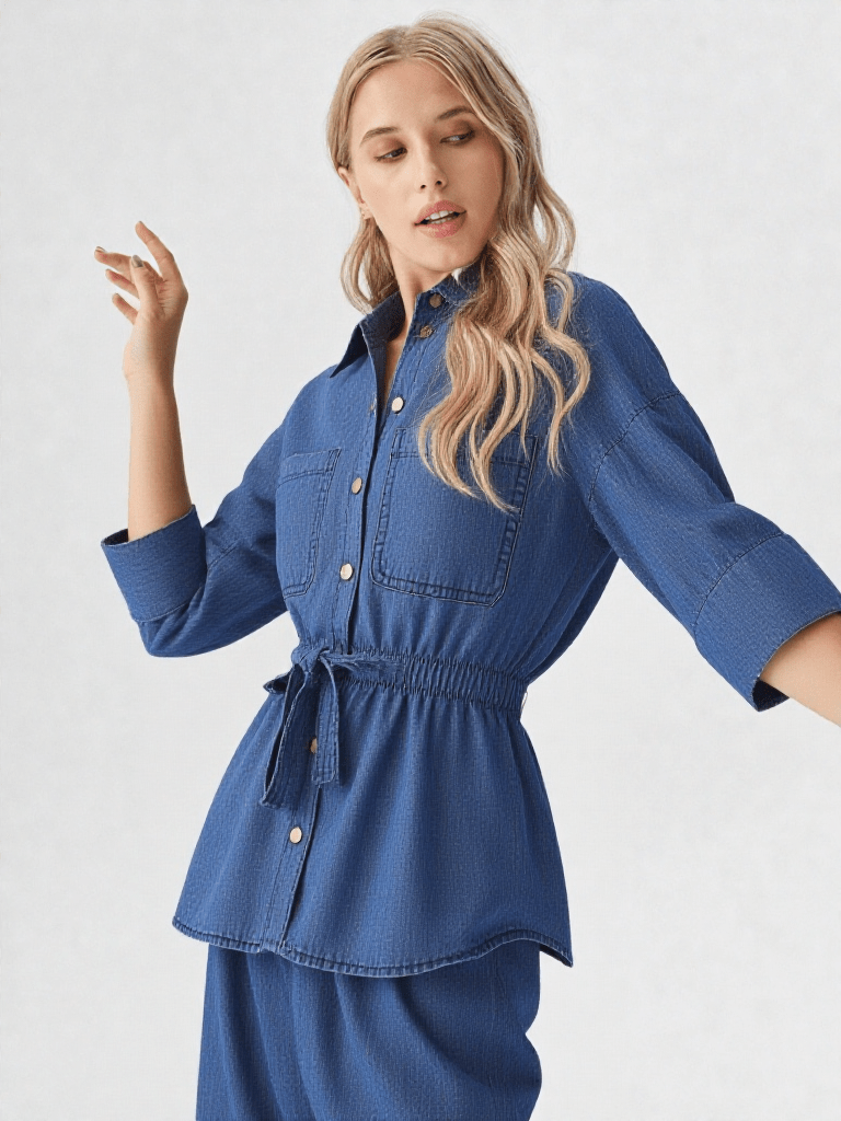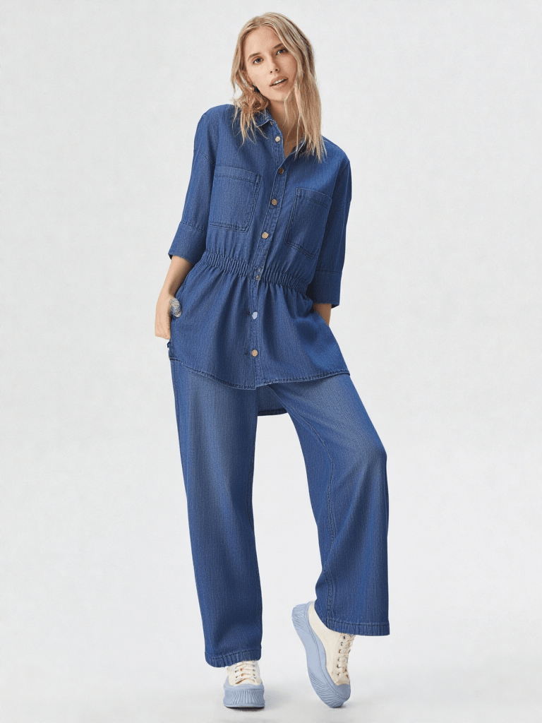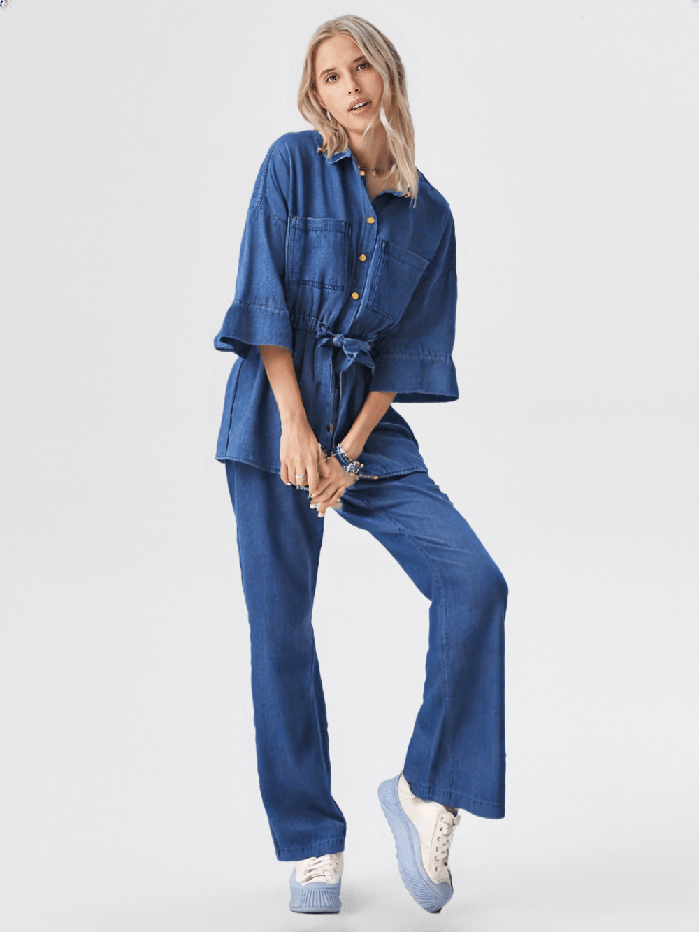 This ZERAINS women's set features a slim, single-breasted denim shirt with a turn-down collar and full-length sleeves, paired with ankle-length pants designed for a mid-waist fit. Crafted from a comfortable blend of polyester and cotton with natural fibers, the outfit includes elegant bow decorations and sashes for a refined look. The pants have a zipper fly closure, and the shirt offers a full opening for ease of wear. Suitable for all seasons, this ensemble combines classic tailoring with modern style for versatile, everyday wear.