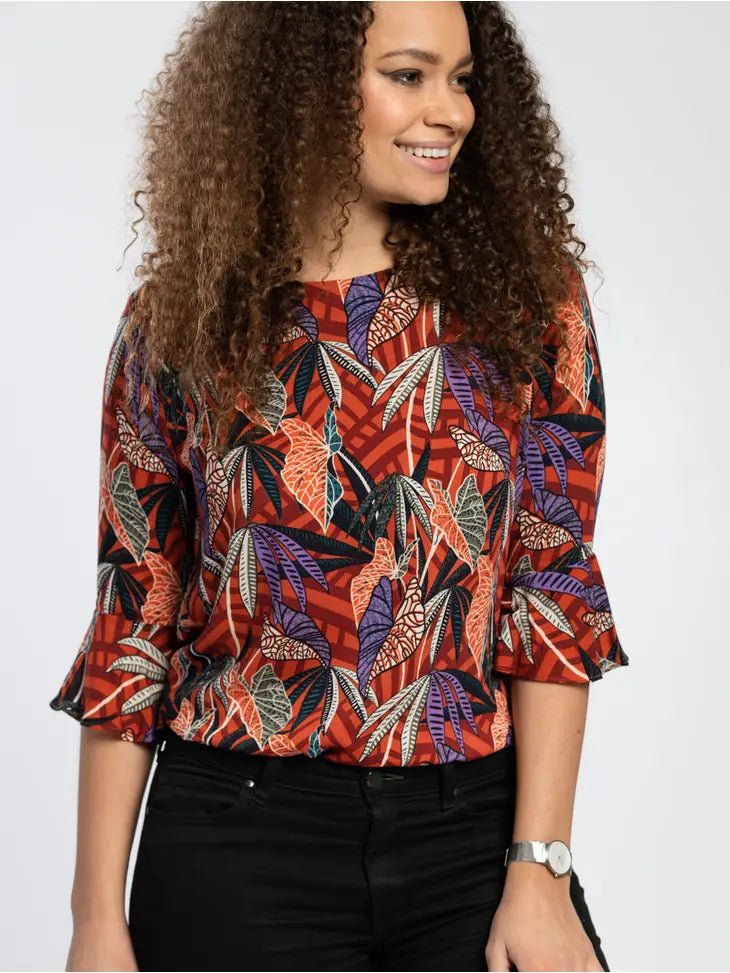 تتميز هذه البلوزة ذات الأكمام المخددة بنمط أوراق الشجر النابض بالحياة، وهي مثالية لإضافة لمسة أنيقة من الألوان إلى أي ملابس. مصنوع من قماش خفيف الوزن، هذا الثوب يوفر التهوية والراحة، مما يجعله رائعًا للارتداء طوال اليوم.