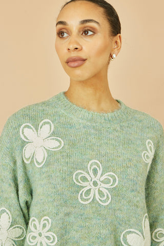 Yumi Green Relaxed Knitted Jumper With Crochet Flowers
