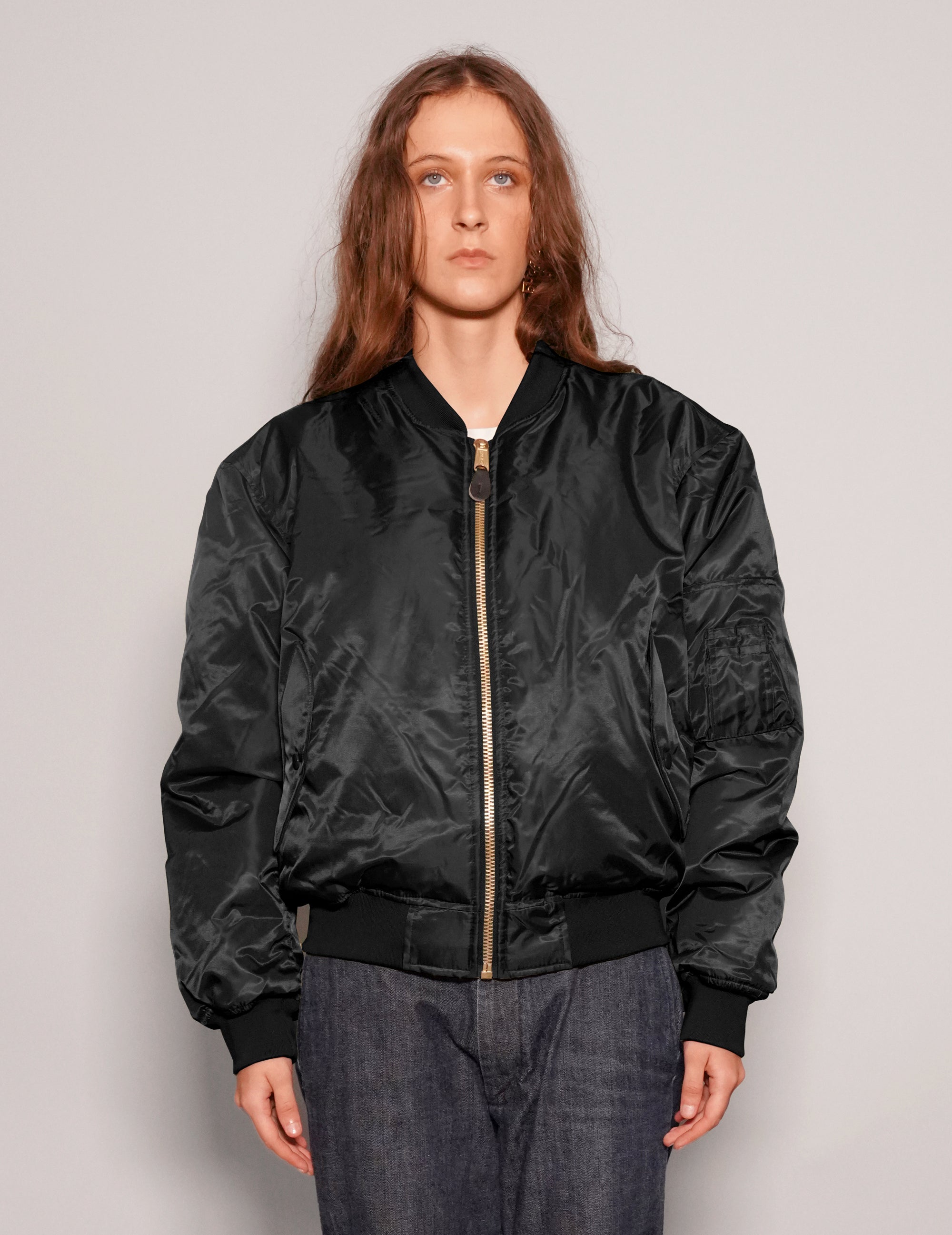 The classic MA-1 bomber jacket in black, originally designed for the U.S. Air Force and sourced and up-cycled from vintage military dead stock. Features cotton with knit hem and cuffs, side entry flap pockets and zipper sleeve pocket. This style is a reversible design with a bright orange lining with interior pockets, originally intended for emergency visibility.