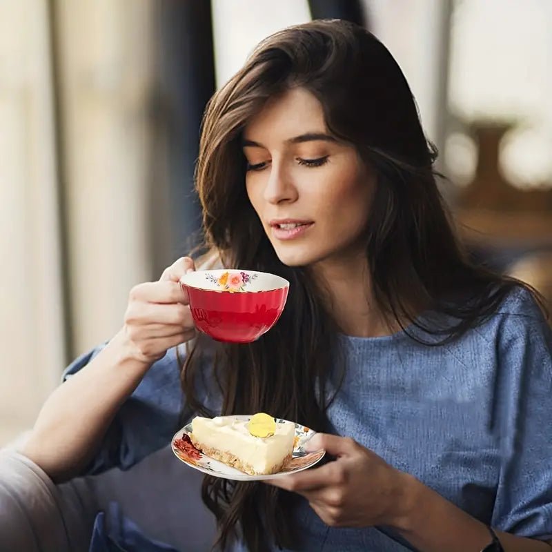 Featuring a stunning golden trim and vibrant red floral patterns, this cup is not just a vessel for your beverages but a piece of art that will enhance your dining table. The elegant stripes combined with the floral lines create a sophisticated aesthetic that is sure to impress your guests.
