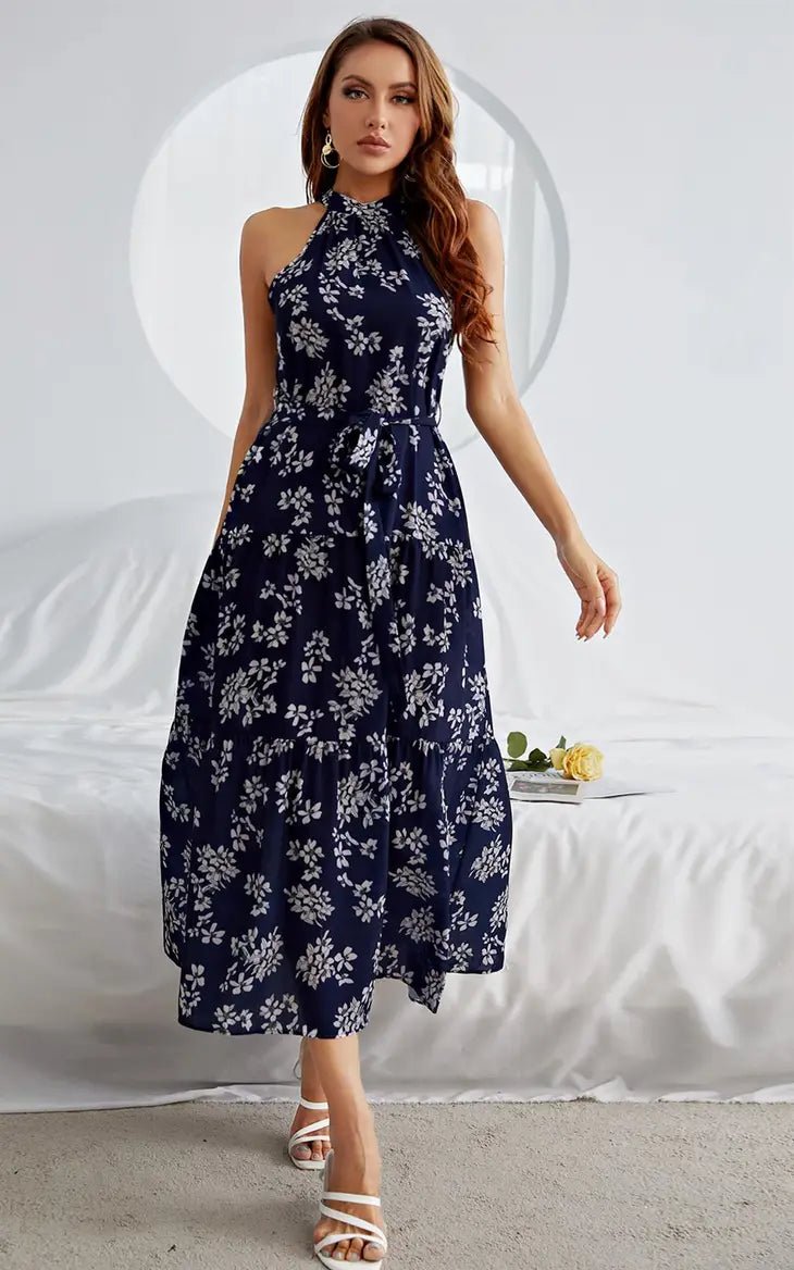 Halter Neck Midi Layer Dress in Nave & White Flora Print