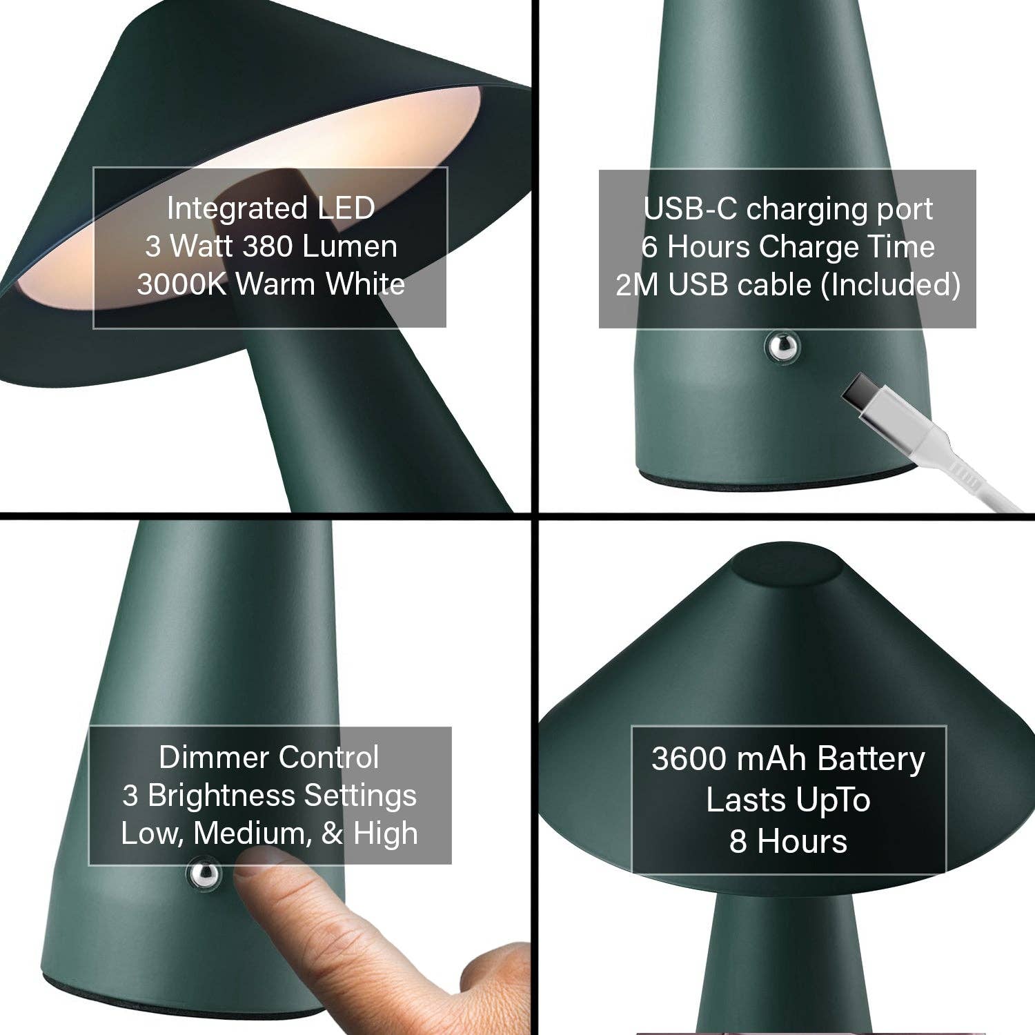 Modern portable and rechargeable metal table lamp with a sleek matt deep forest green finish and matching green metal shade. Perfect for enhancing any space with a touch of elegance and functionality Includes 3w 3000k (warm white) LED. The lamp uses 2 x 1800mAh lithium ion batteries and has a usage of upto 8 hours (on the lowest setting). Once fully discharged the lamp with charge in approximately 6 hours. 3-step touch dimmer function - low, medium and high settings. On the high setting the lamp produces 380 lumens. There is a USB-C port in order to charge and includes a 2m cable. A small indicator light is next to the port which will turn from red to green once fully charged. This lamp is IP20 rated and is built for indoor use only. The total height is 27cm and the diameter of the shade is 19.6cm.