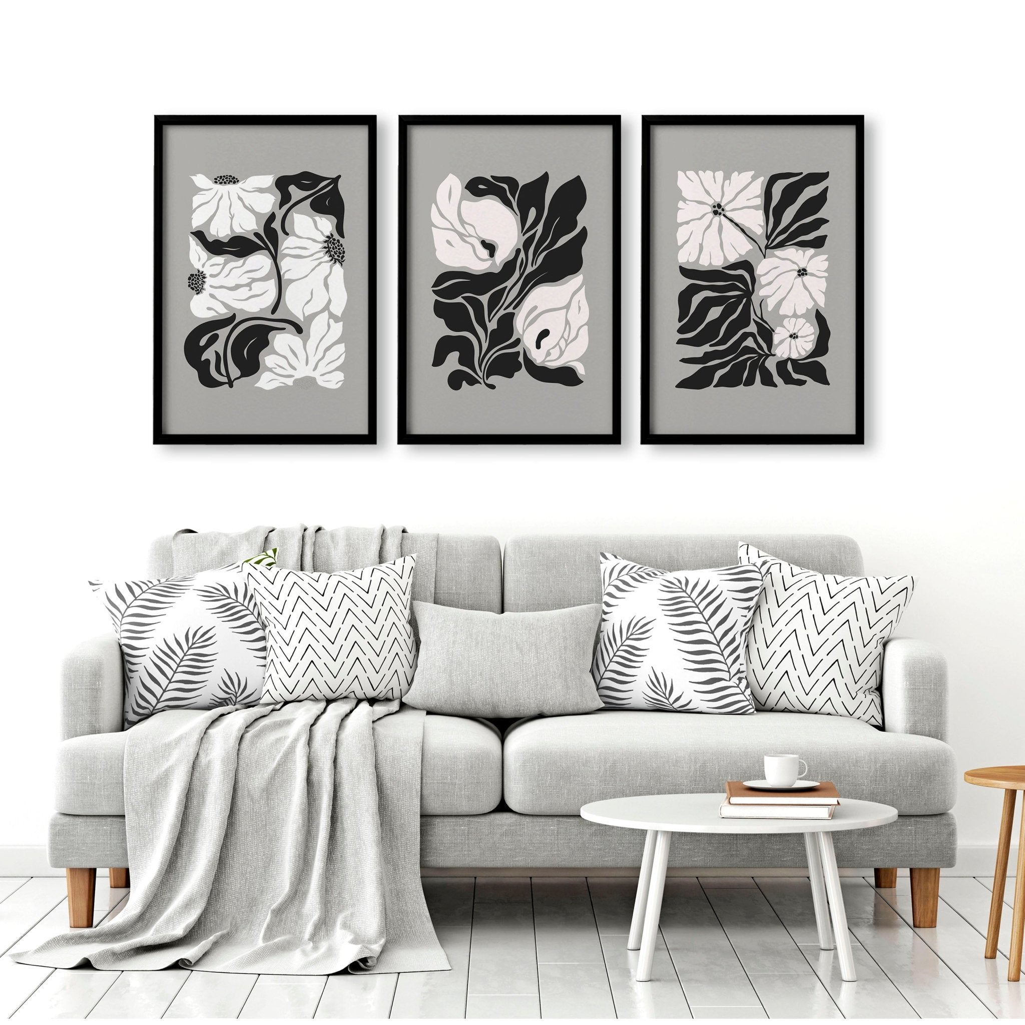 Embrace the charm of a carefully curated gallery right in your living room. The black-and-white tones of these botanical prints add a sophisticated touch, bringing balance and harmony to your home decor. Your space will feel more open, inviting everyone to relax in its serene beauty.