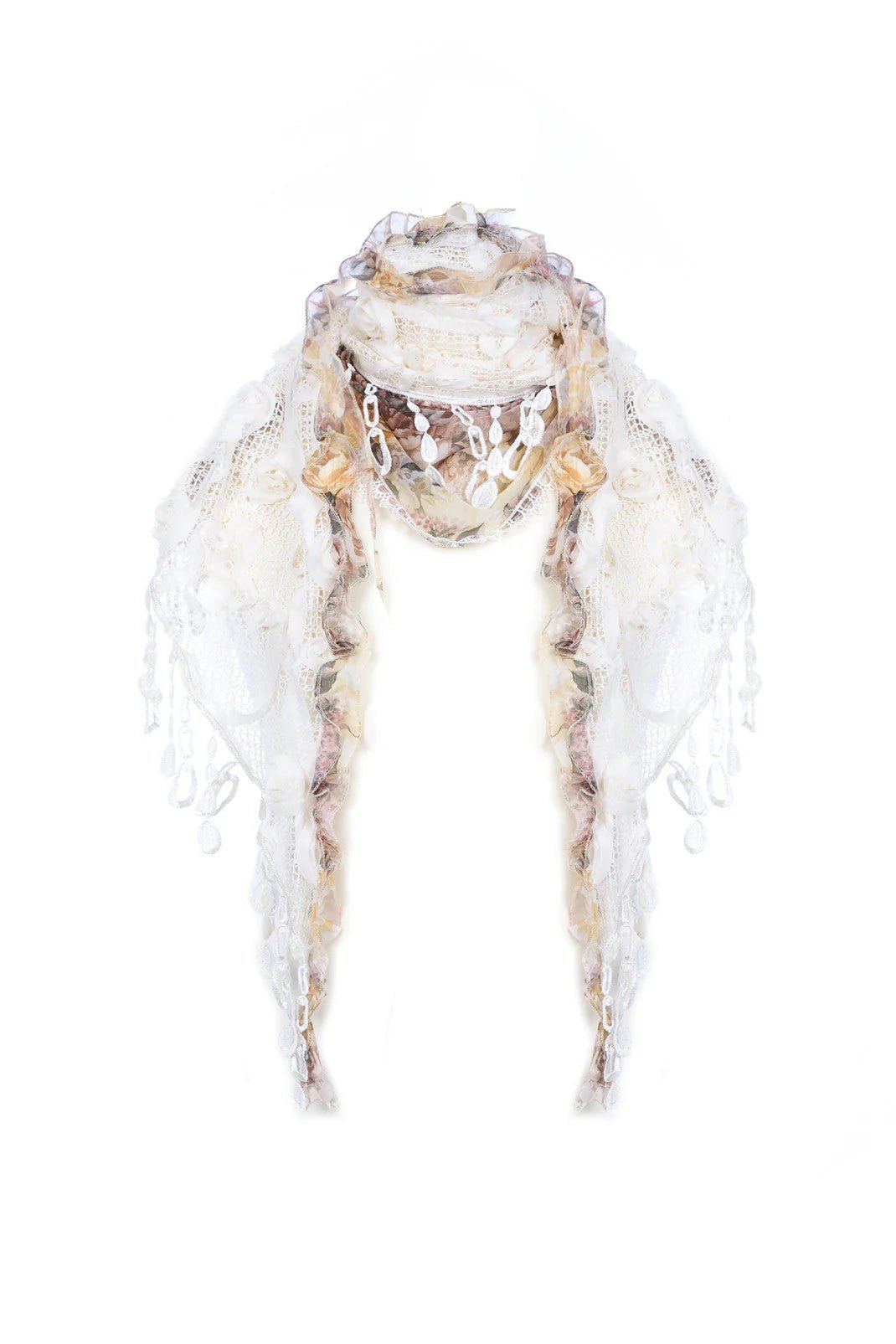 Elevate your style with JAYLEY's luxurious Cream Silk Chiffon and Vintage Inspired Lace Shawl. Crafted with delicate vintage lace and silk chiffon, this versatile piece effortlessly adds a touch of sophistication to any look. Perfect for both daily wear and formal occasions, this shawl is truly a must-have for any fashion-forward individual. One size fits all.