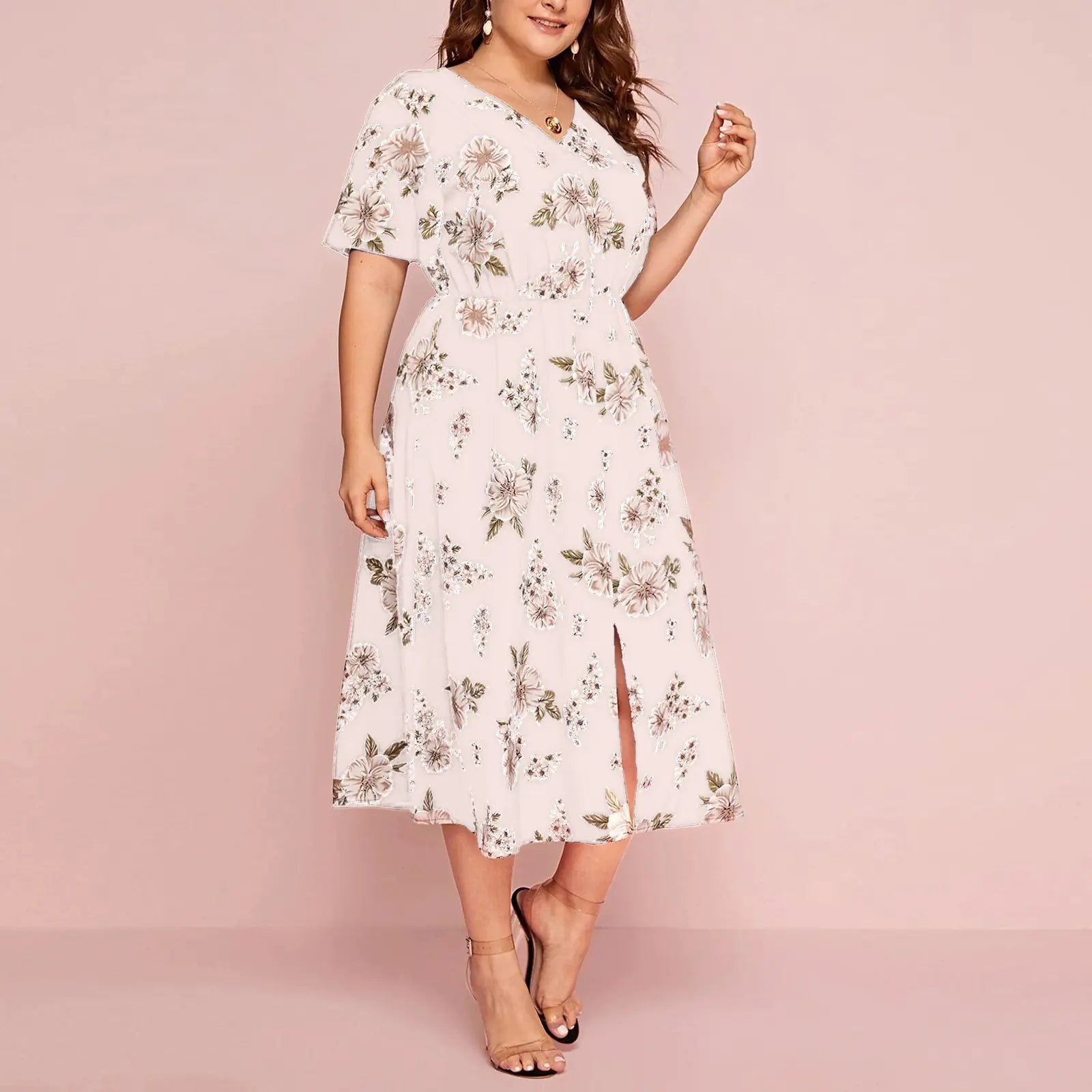 Plus Size Floral Print V-Neck Short Sleeve Midi Dress
