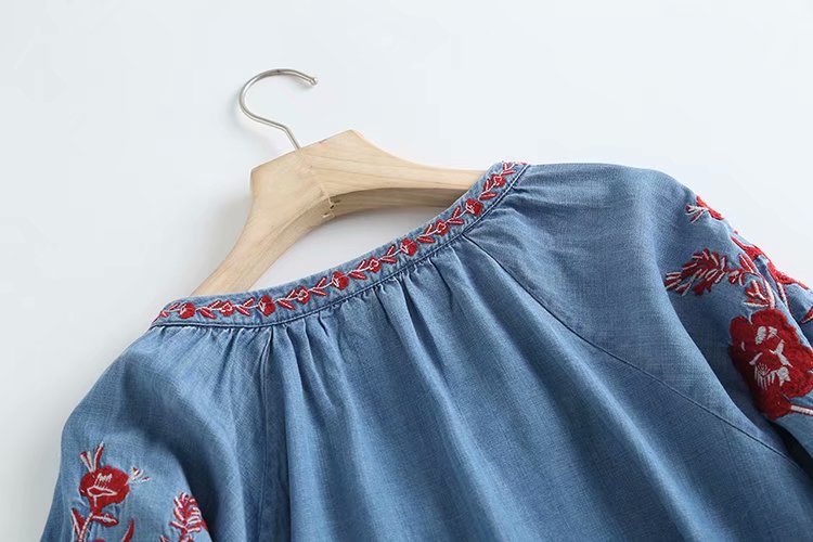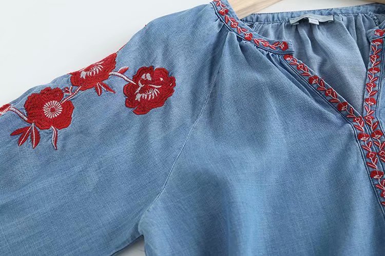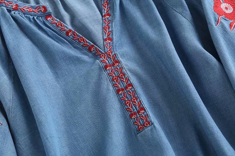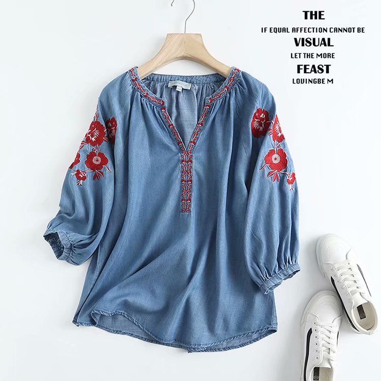 New V-neck Puff Sleeve Embroidery Tencel Denim Loose Pullover Shirt