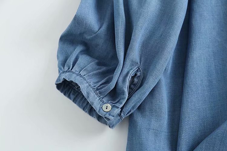 Introducing our New V-neck Puff Sleeve Embroidery Tencel Denim Loose Pullover Shirt! Made with high-quality tencel denim, this loose shirt features a flattering v-neck and stylish puffed sleeves with intricate embroidery. Enhance your wardrobe with this versatile and chic piece.
