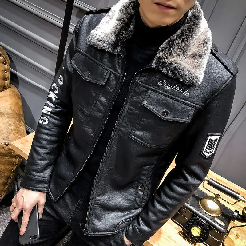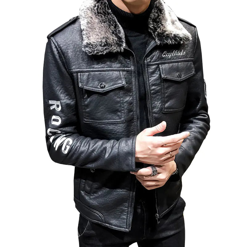 Elevate your style this autumn and winter with our latest trendy black leather jacket. This fashionable piece combines the rugged appeal of classic aviator jackets with the sophisticated touch of shearling wool collars, making it a must-have for any modern man's wardrobe.