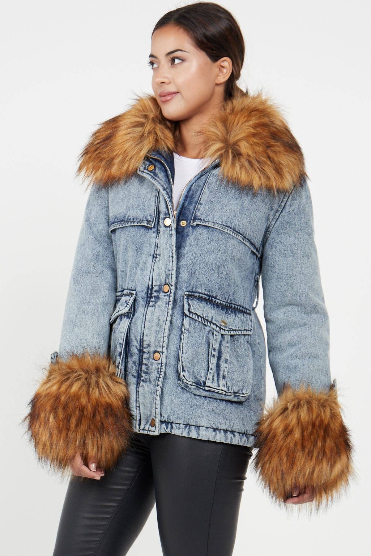 Faux Fur Cuff and Collar Padded Belted Denim Jacket | Hstrends