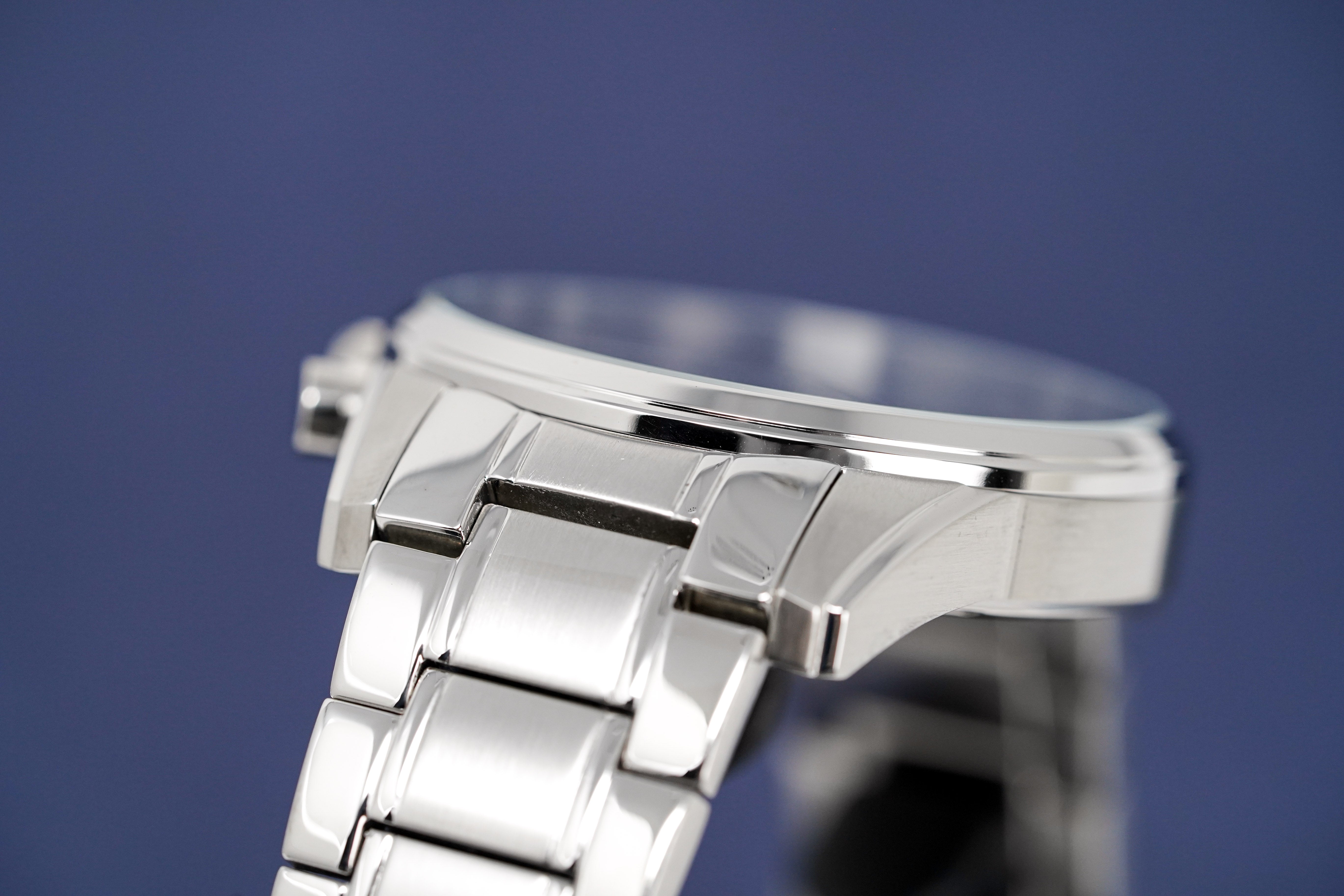 Blue Sunburst Dial. Luminous Steel Hands. Stainless Steel Arabic Numerals. Date Window at 4:30.