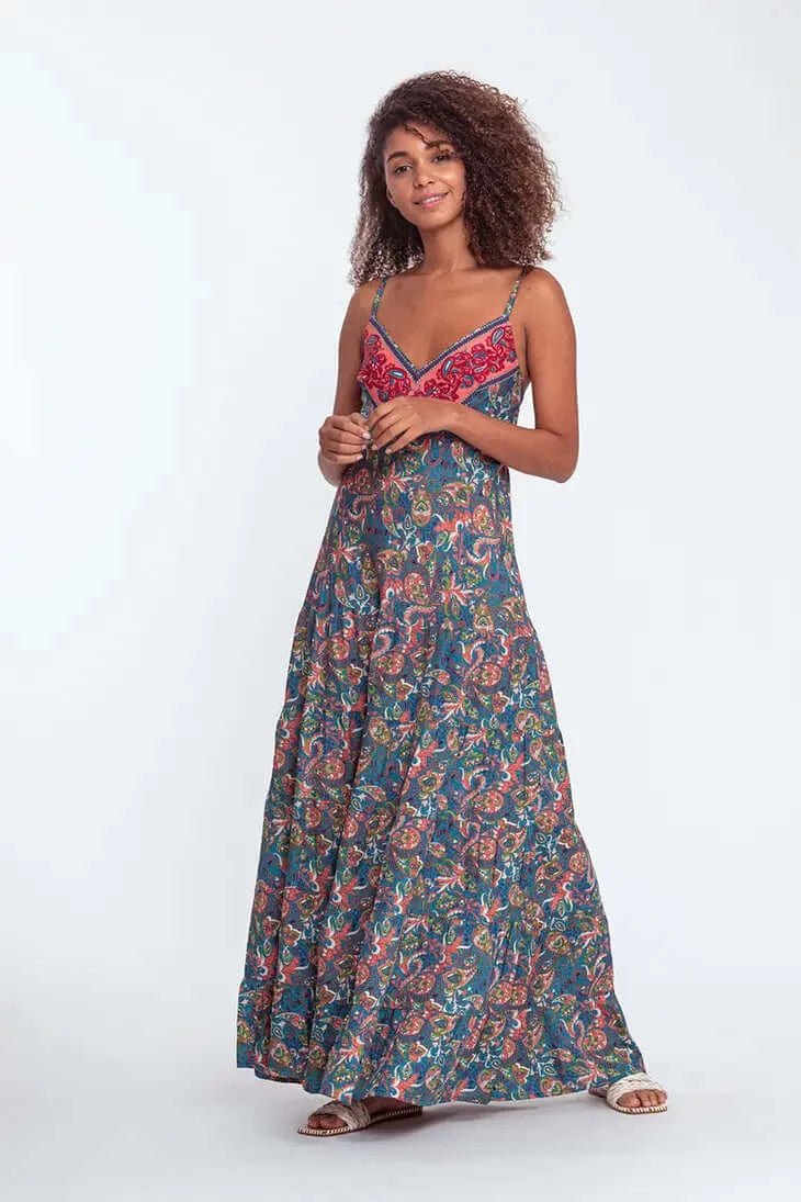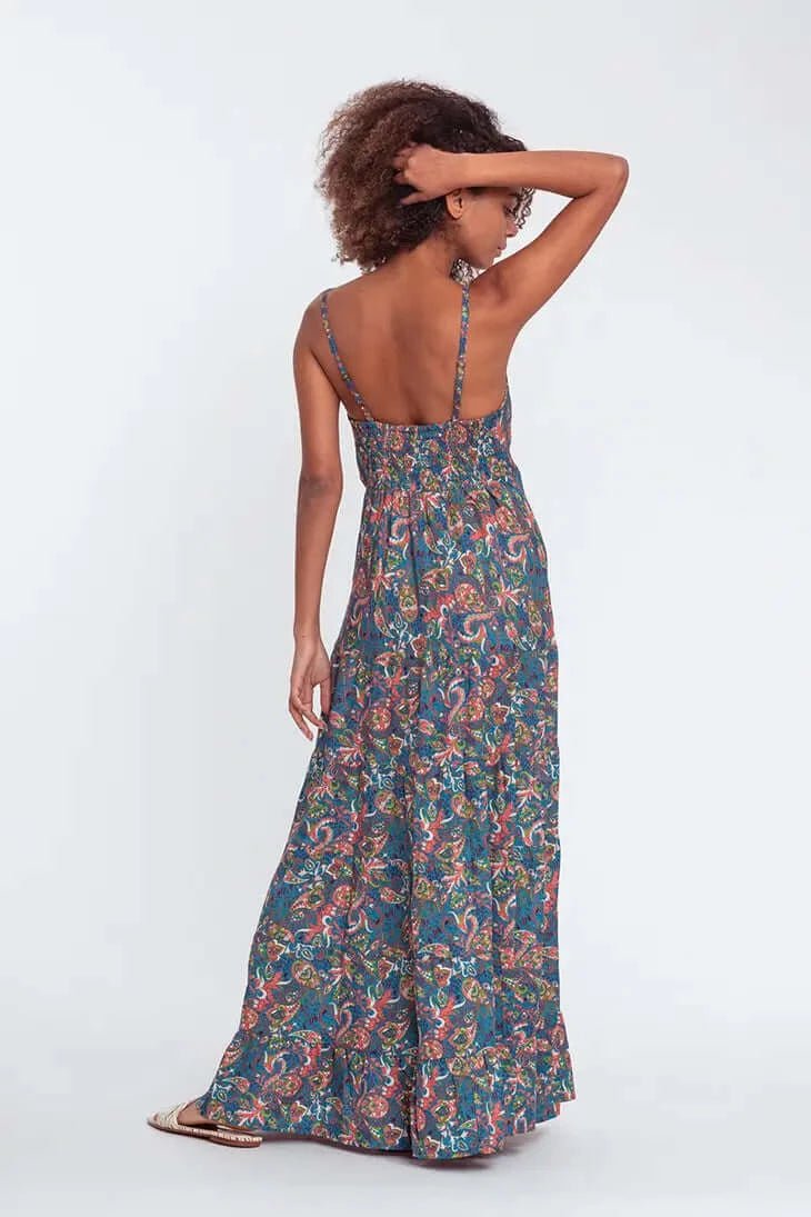 Printed synthetic silk long dress. Thin adjustable straps. V neckline. Smocked back. 4 ruffles on the skirt. Length: 140 cm in size s/m.