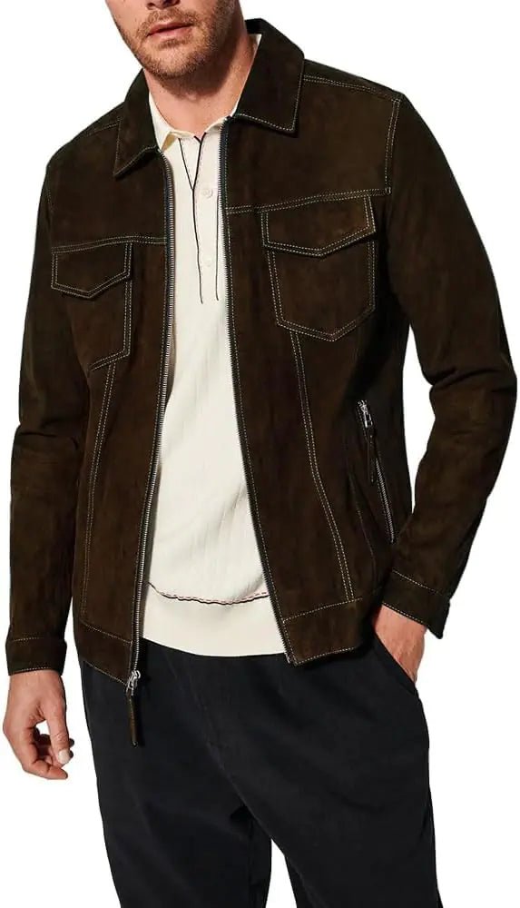 ["PREMIUM 100% GENUINE SUEDE LEATHER: Our Mens Leather Jacket made with 100% genuine Suede Cowhide leather. Mens leather bomber Jacket has Classic good top leather-wear and more fashionable look.Inspired by western style crafted from high-quality genuine suede leather with premium stitching for an authentic and durable look." COLLAR FASHION-ABLE LOOK & MULTIPURPOSE POCKETS: This Motorcycle jacket Shirts suits you best because it is unique & different in style from other’s. Suede leather Bomber jacket features a shirt collar 2 Zipper & 2 flaps pockets 2 interior pockets buttoned cuffs and double stitching for strength. It also has a soft smooth surface with Zipper fastening. Cowboy jacket for men Incorporates a pointed collar Zipper closure and snap tab button cuffs echoing classic western fashion with a modern touch. Unleash your inner adventurer with a statement piece that turns every outing into an unforgettable experience. Get yours today! Timeless Design : Rich texture detailing to make you appear more fit from the outside while maintaining the comfort level from the inside. Once you wear our motorcycle jacket men you will feel like it’s your second skin.men cowboy shirt cowboy leather jacket men leather jacket cowboy cowboy fringe shirt men Provides durability style and functionality making it an essential and versatile piece in your wardrobe for various occasions. Please Check Our Size Chart In Images Section to Avoid any Sizing Issue.]