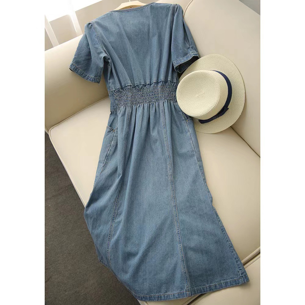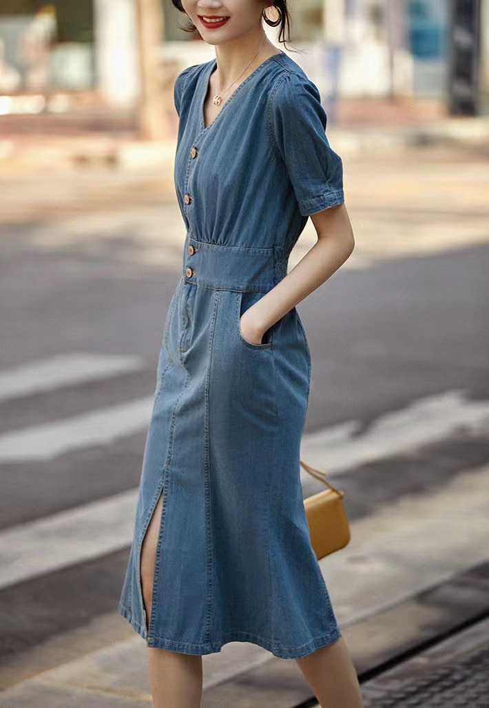 Experience elegance and style with our French Retro Design Waltz Mermaid Tail Waist Slim V-Neck Denim Dress. Perfect for any occasion, this dress accentuates your waistline and flatters your figure with its slimming design. Embrace your inner fashionista and make a statement with this unique and eye-catching dress.