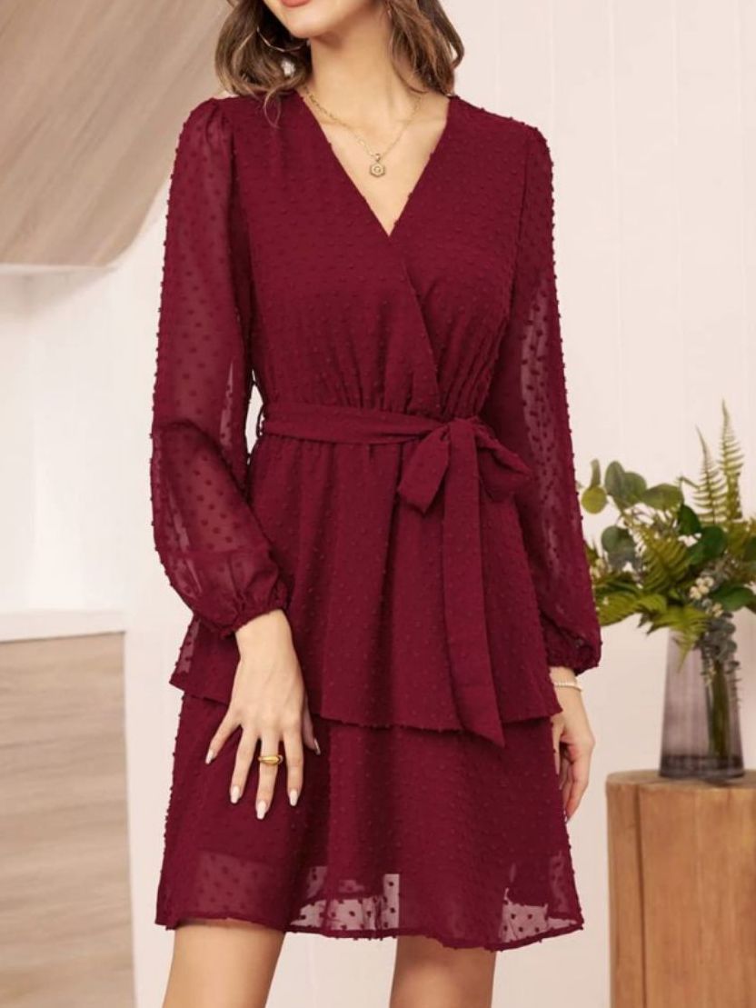 Chiffon V-neck Lantern Long-sleeved Cocktail Belt Dress | Hstrends