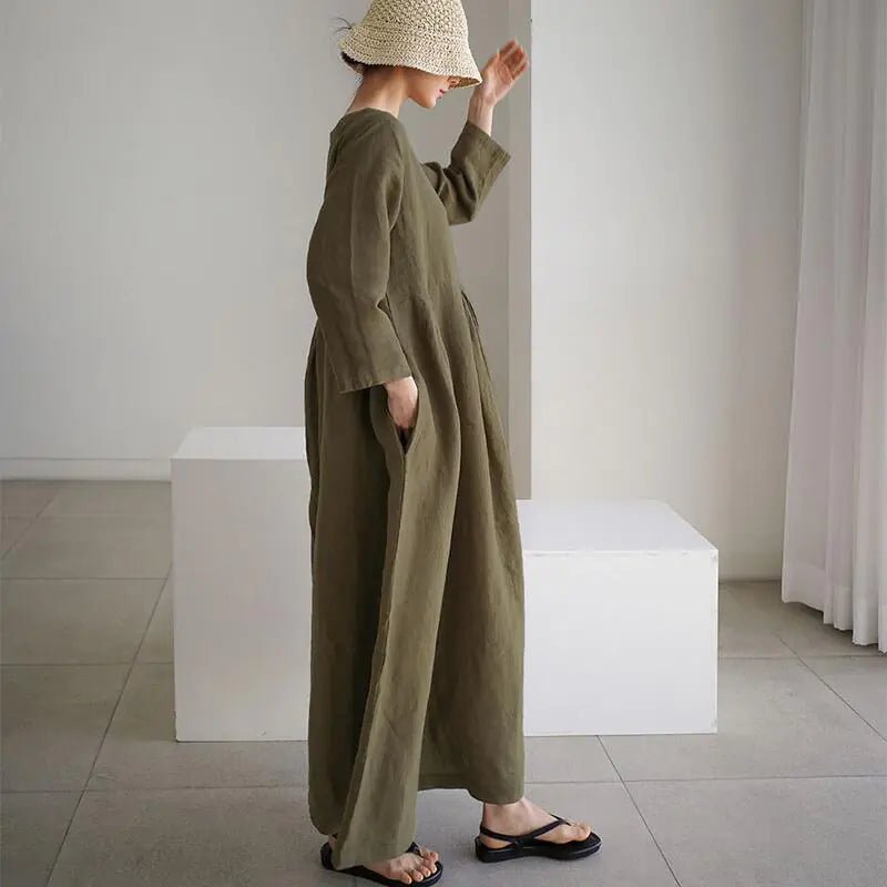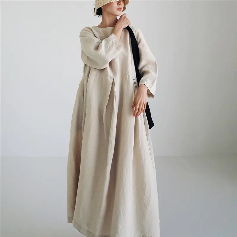 Crafted from high-quality cotton linen, this dress features a round neck and long sleeves, offering a flattering silhouette that complements all body types. The mid-rise waist provides a comfortable fit while accentuating your natural curves.