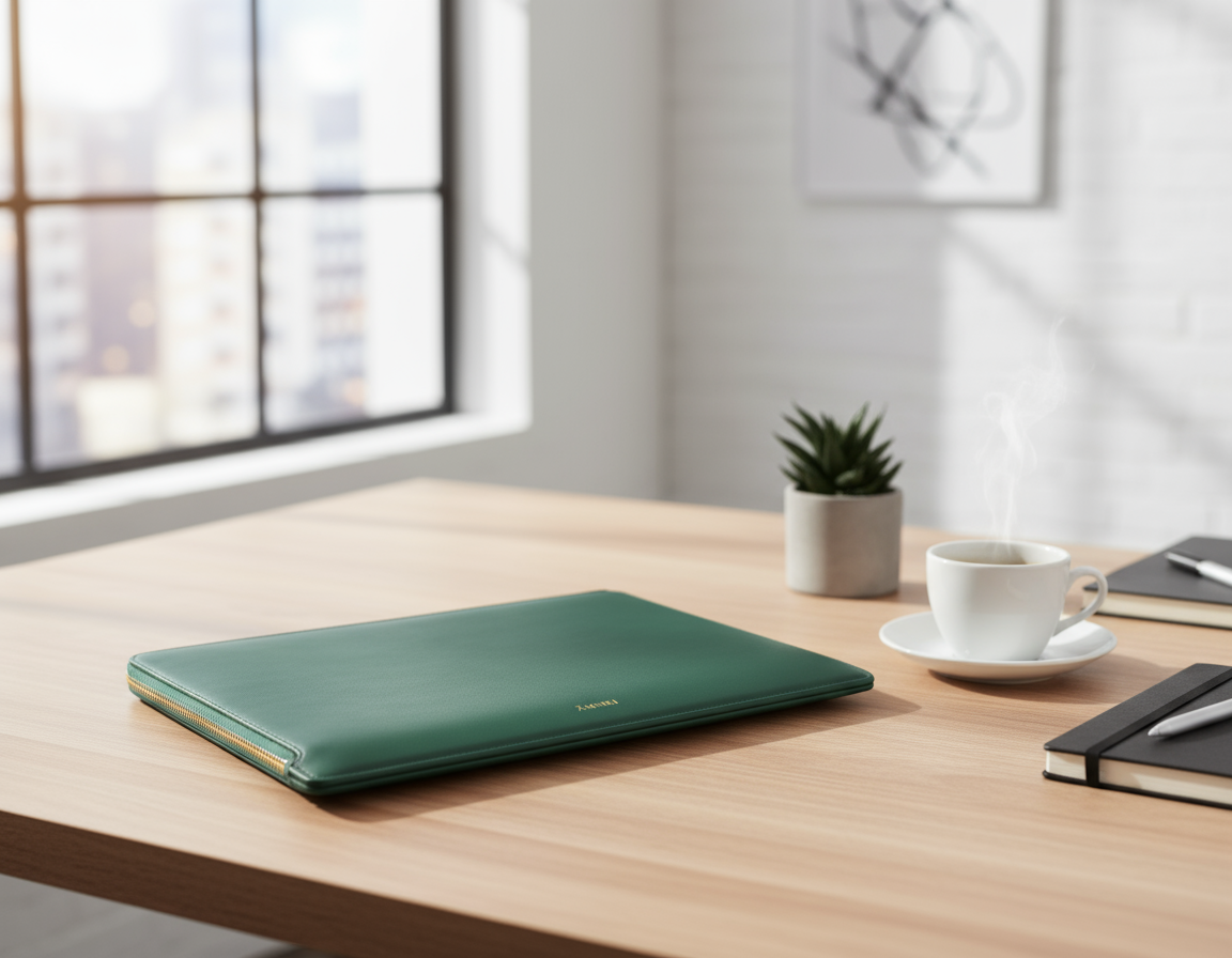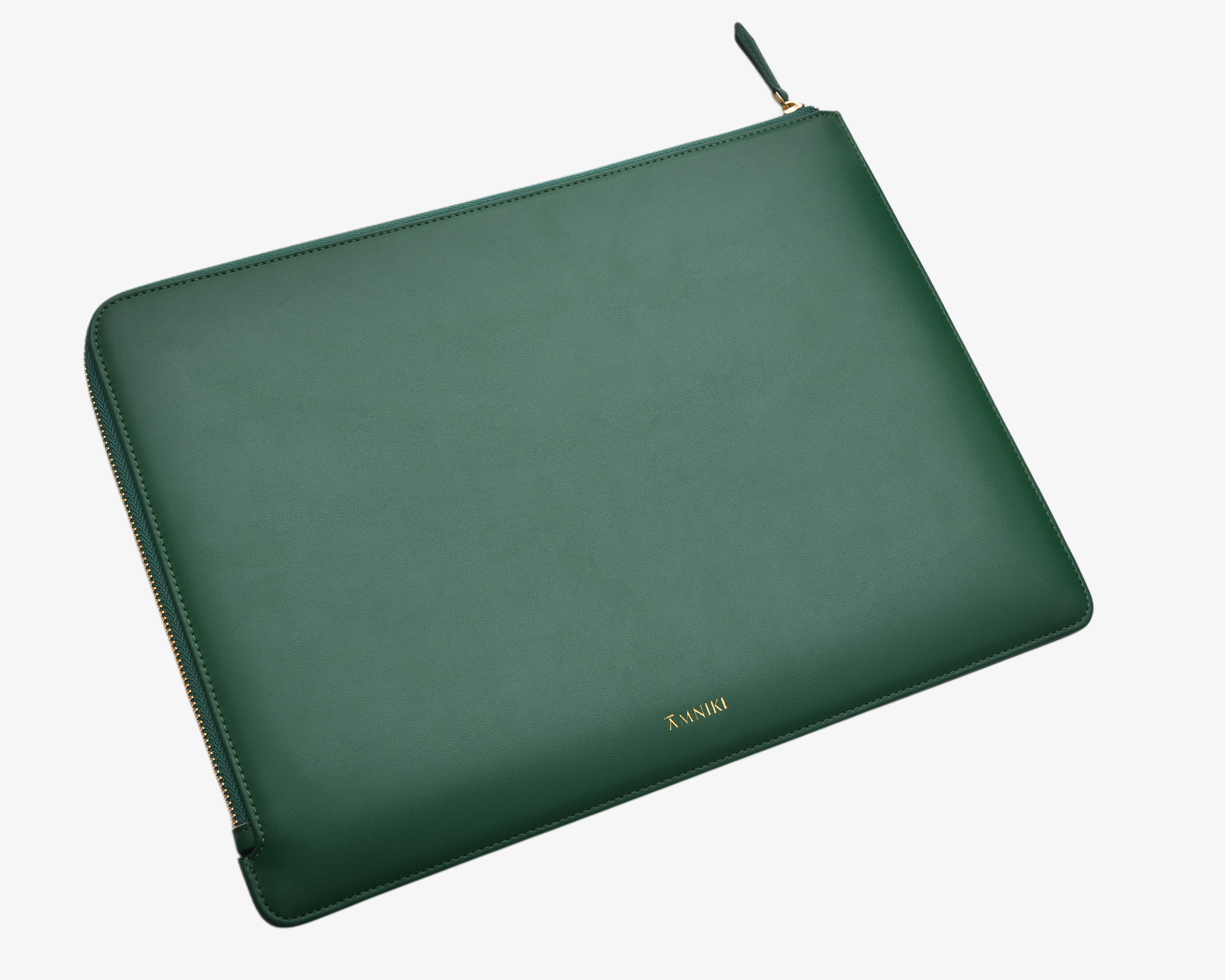 The Deep Emerald Green Laptop Sleeve is a must-have for professionals who seek sophistication and functionality in one sleek design. Crafted with premium vegan leather, this sleeve offers a secure fit for your device while adding a touch of elegance and durability.